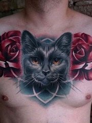 男性满胸漂亮的玫瑰花和猫纹身图片