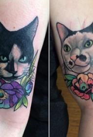 手臂纹身素材 男生手臂上彩色的花朵和猫咪纹身图片