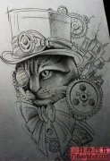蒸汽朋克风格猫纹身手稿作品