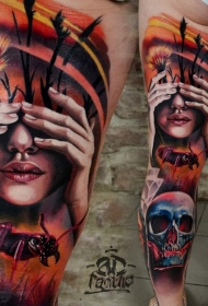 腿部彩色的女性蚂蚁和骷髅纹身图案