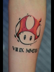 男生小腿上彩绘几何线条玛丽奥蘑菇和星星纹身图片