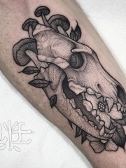 小臂点刺欧美恐龙头骨蘑菇纹身图案