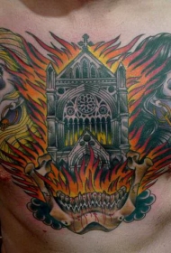 胸部old school彩色恶魔女人和燃烧的大教堂纹身图案