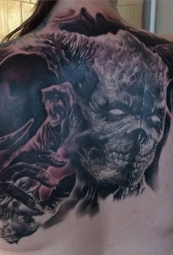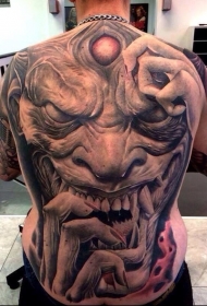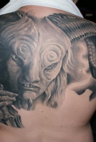 背部非常可怕的黑灰恶魔肖像纹身图案