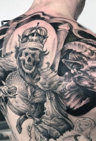 背部令人毛骨悚然黑灰骷髅王与恶魔纹身图案