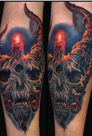 插画风格的彩色魔鬼头骨与蜡烛纹身图案