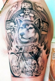 大臂狼头摩托车和火焰纹身图案