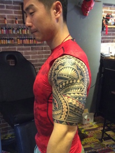 肌肉男士拥有劲爆的传统半甲纹身图片