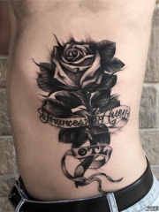 侧腰欧美new school黑灰玫瑰花纹身图案