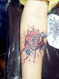 大臂迷人的3D年轻吸烟女士肖像和红玫瑰纹身图案