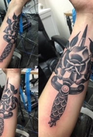 欧美匕首纹身 男生手臂上文艺花朵纹身图片