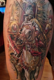 大腿精彩的彩色中世纪骑士和马纹身图案