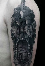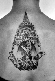 背部雕刻风格黑色中世纪大教堂与手纹身图案