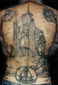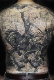 背部中世纪主题色梦幻精灵和勇士纹身图案