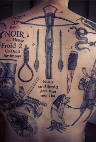 背部雕刻风格黑色的各种中世纪物品纹身图案