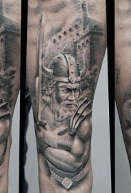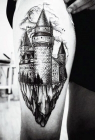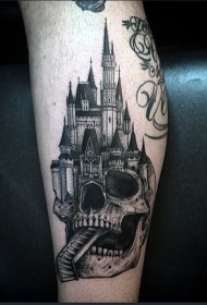 小腿惊人的黑白中世纪城堡和骷髅纹身图案