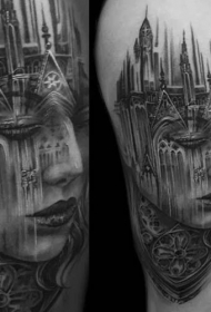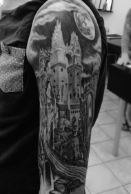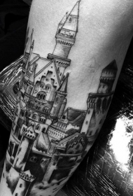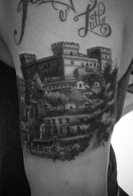 手臂华丽的写实黑灰中世纪城堡纹身图案