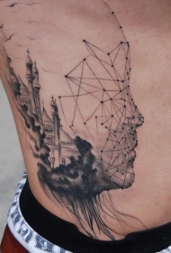 神秘的黑色点线链接人像与城堡侧肋纹身图案