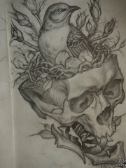 欧美鸟巢骷髅植物纹身图案手稿