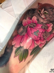 大腿欧美school骷髅乌鸦牡丹花纹身图案