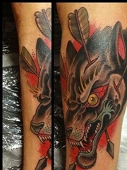 小腿上的school风格狼头纹身图案