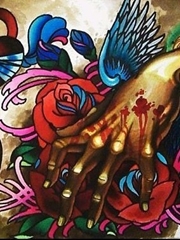欧美女生图腾花臂上纹彩色怀抱骷髅的布娃娃图案