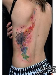 女生侧腰上黑色线条水彩泼墨蒲公英纹身图片