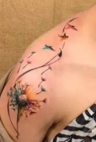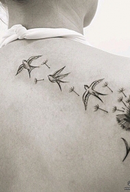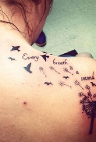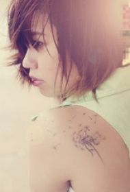 女生肩部黑色小鸟轮廓和植物蒲公英纹身图片