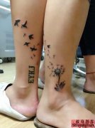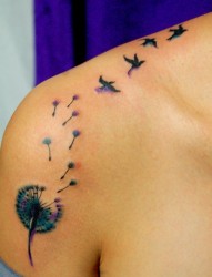 女人肩背小巧唯美的蒲公英与小鸟纹身图片