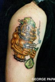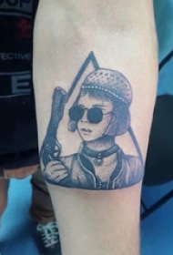 男生手臂上黑灰点刺几何线条枪和人物纹身图片