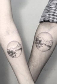 情侣手臂上黑色素描点刺技巧创意江边风景纹身图片