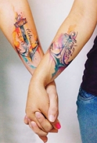 情侣手臂上彩绘花臂抽象线条与花仙子纹身图片