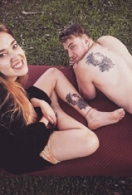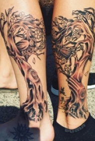 情侣小腿上黑灰素描点刺技巧创意生命树纹身图片