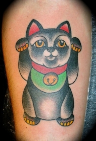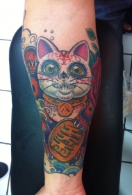 手臂日式彩色招财猫骷髅花朵纹身图案