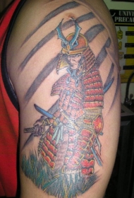 肩部彩色日本武士与剑纹身图片