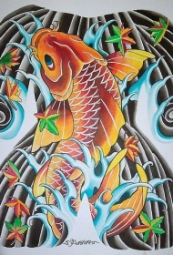 日式彩色黄金锦鲤纹身手稿