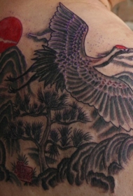 肩部水墨仙鹤山水纹身图案