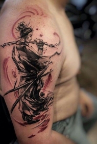 肩部水墨风日本武士纹身图案