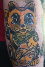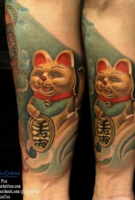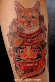 美丽的日本招财猫和花朵五彩手臂纹身图案
