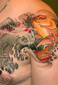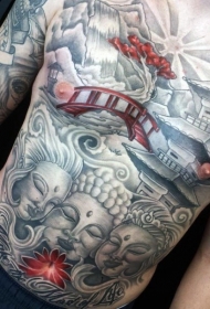 胸部日本传统风格彩色武士艺妓房屋纹身图案