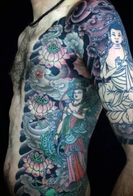 old school神秘的日本招财猫娃娃和鲜花手臂纹身图案