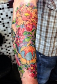 手臂上鲜艳的各种花朵纹身图案