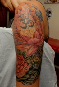 大臂粉红色的莲花和波浪纹身图案