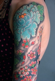 手臂蓝色的牡丹花和粉色樱花纹身图案