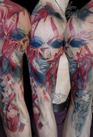 满背彩绘骷髅艺妓和仙鹤纹身图案