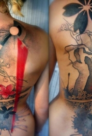 背部日本传统色的阴阳八卦和樱花树字符纹身图案