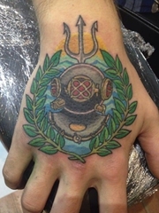 彩色时尚花臂纹身潜水员和鳗鱼和海神三叉戟纹身图片