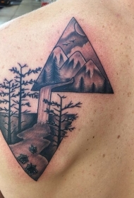 背部黑色的三角形与山区河流森林纹身图案
