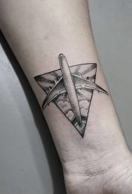 手腕点刺风格黑色大飞机与三角形纹身图案