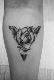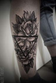 小腿欧美黑色玫瑰与三角形纹身图案